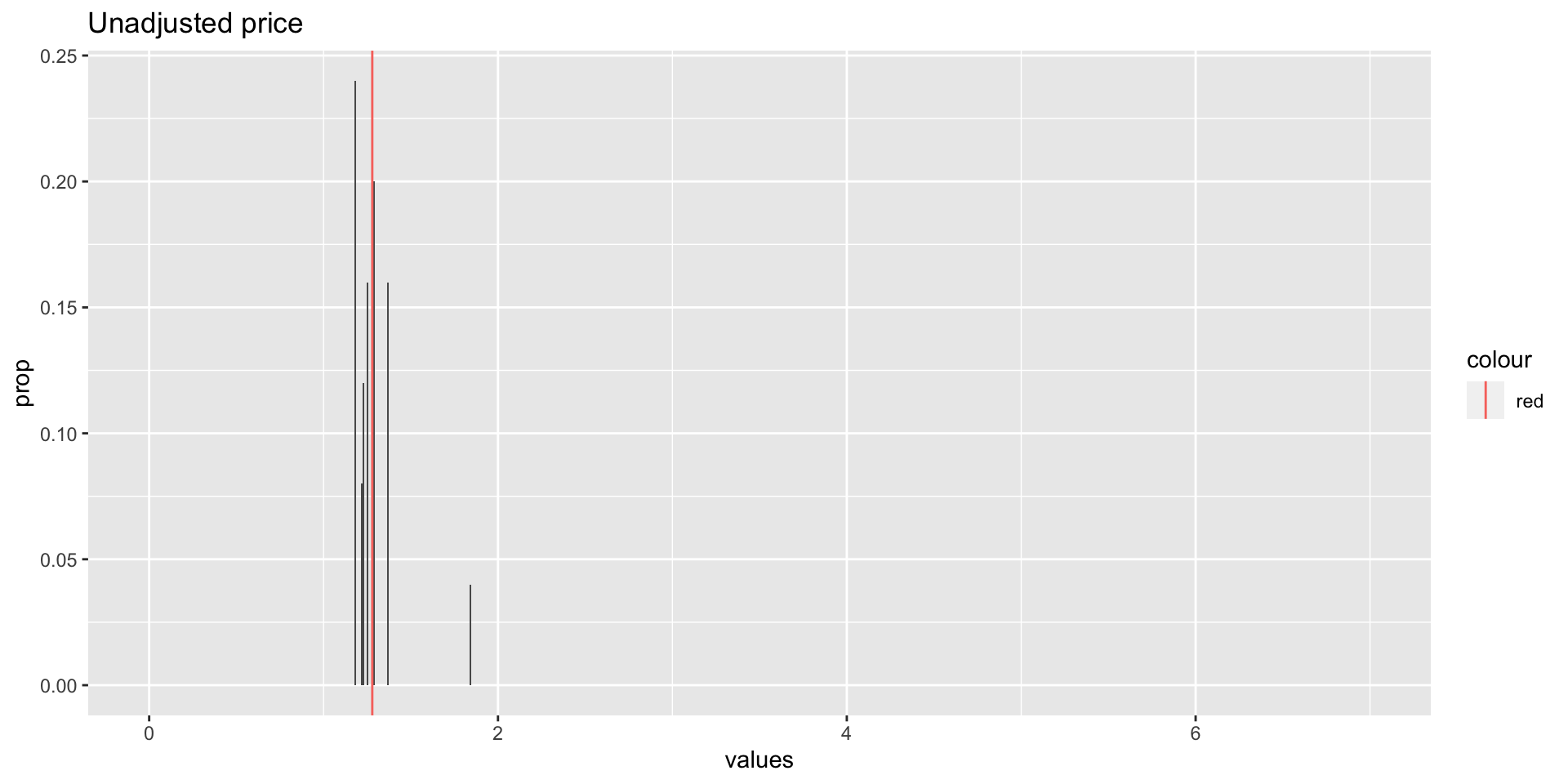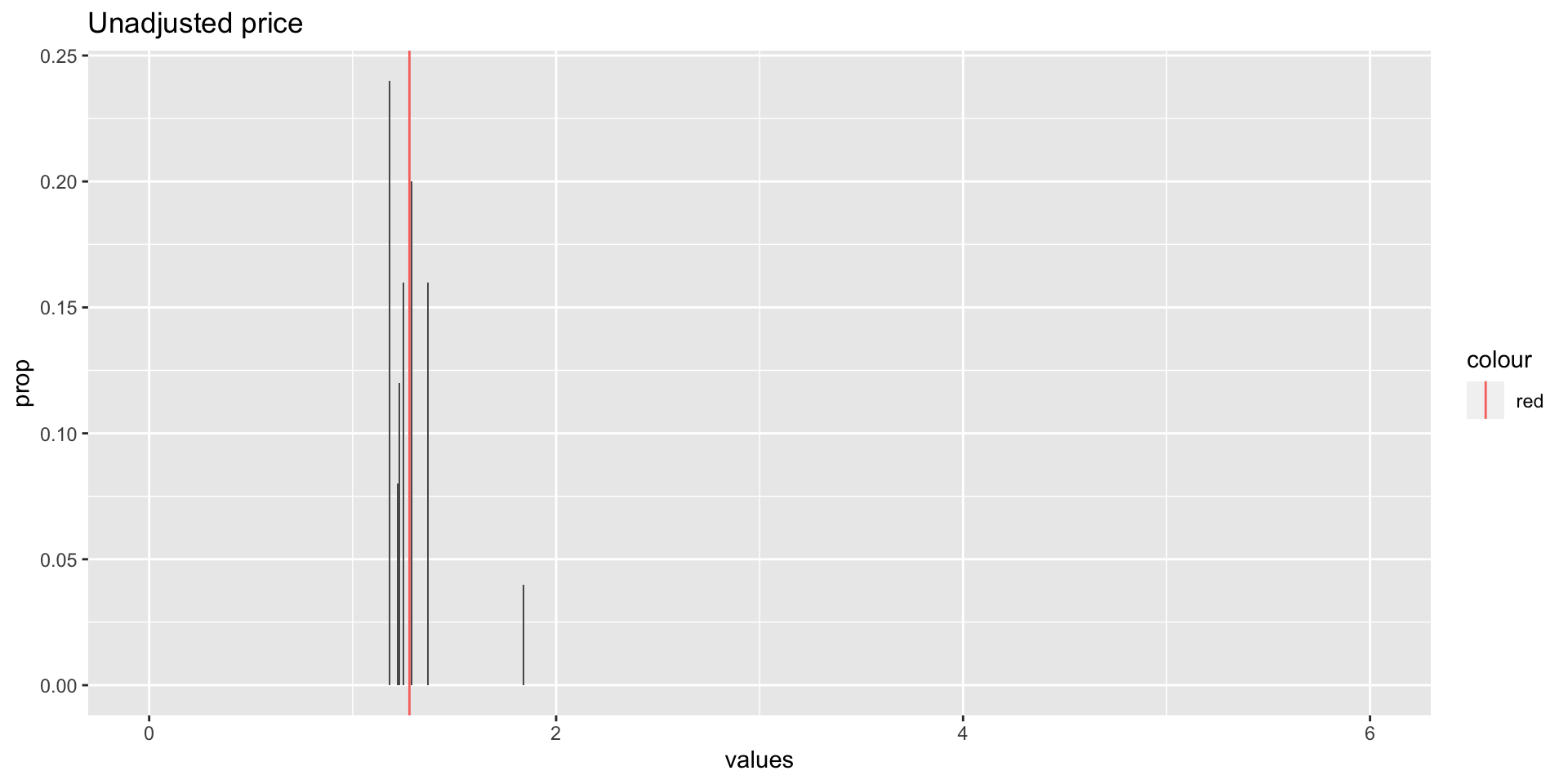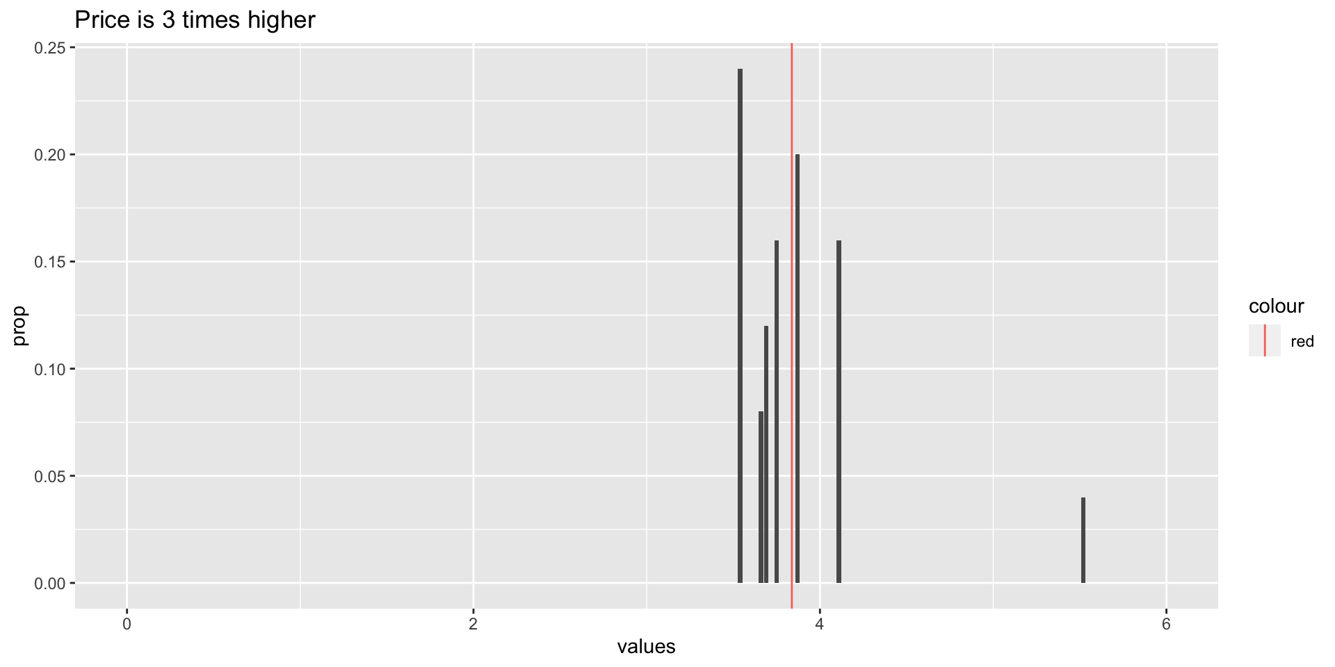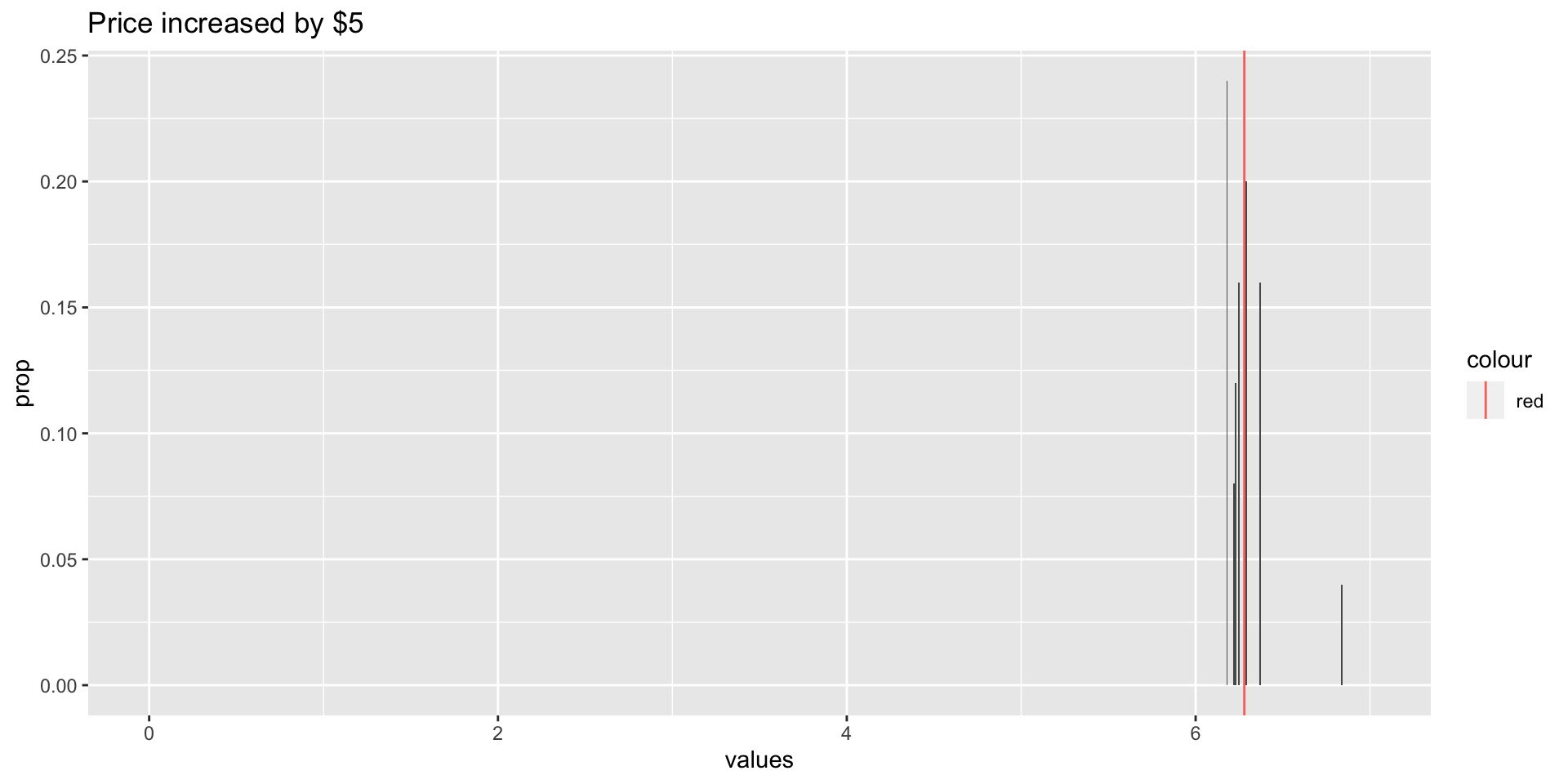 geom_vline(aes(xintercept = mean, color = "red")) # and line of meanAll the stock values have increased by $5:
